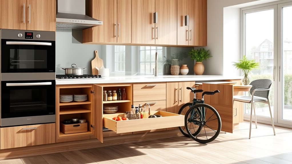 To make your kitchen more accessible, start by lowering counter heights so you can comfortably reach everything. Incorporate accessible storage solutions that keep essentials within easy reach from a wheelchair. These adjustments help create a functional, inclusive space tailored to your needs. Additionally, choosing ergonomic design elements can further enhance comfort and usability in your kitchen.