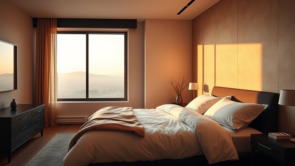 Using smart lighting provides precise control, so you don’t have to manually change bulbs or rely on inconsistent fixtures. You can program your lights to adapt automatically based on the time of day or your routine, ensuring your environment supports your circadian health. This dynamic adjustment helps regulate melatonin production, the hormone responsible for sleep, by mimicking natural light patterns. When your lighting changes in harmony with your body’s needs, you’re less likely to experience sleep disturbances or fatigue. Additionally, understanding the significance of light quality can further enhance how effectively your environment supports your biological clock.