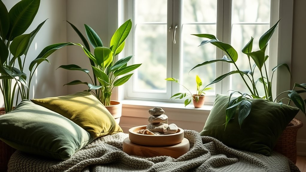 Using green in your environment isn’t just about aesthetics; it’s about intentionally fostering a calming atmosphere. You can start by choosing various shades of green—like soft sage, muted olive, or gentle mint—to create a layered, soothing backdrop. These hues tend to have a subtle, calming effect that reduces anxiety and promotes mental clarity. When you add green accents through plants, artwork, or textiles, you reinforce this connection to nature and deepen your sense of calm. Live plants, in particular, do double duty—they improve air quality and serve as a constant reminder of the natural world, further enhancing your feeling of relaxation.