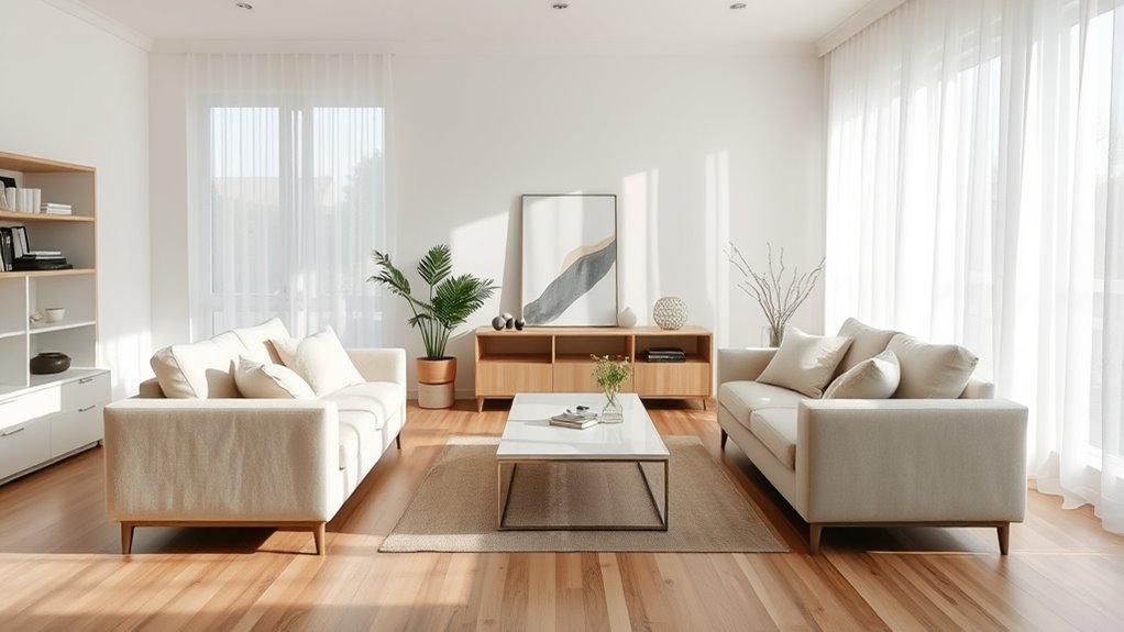 Embracing a minimalist decor style can transform your living room into a serene haven by focusing on simplicity and purpose. Start with artful color palettes that use neutral tones or soft shades to create a calming atmosphere. Limit your color choices to avoid visual clutter and foster cohesion. Incorporate minimalist art displays—simple, uncluttered pieces that add character without overwhelming the space. Keep surfaces clear by choosing a few meaningful decor items rather than many small objects. Opt for sleek furniture with clean lines that blend seamlessly into the room. This approach emphasizes open space and functionality, making your living room feel peaceful and inviting. Remember, less is more when it comes to minimalist decor, helping you achieve a clutter-free, cozy environment.
