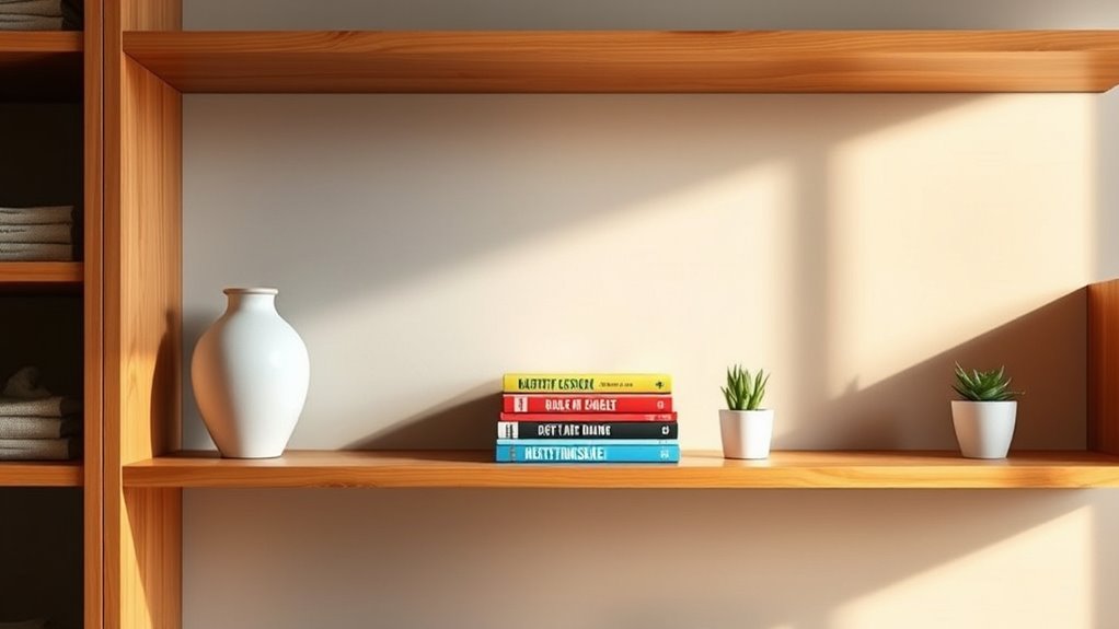 You should choose durable materials like solid wood, metal, or high-quality laminate for your shelves. These options stand up to daily use and resist warping or damage over time. When selecting materials, consider their strength and ease of maintenance to keep your shelves looking great. Regular shelf maintenance, such as tightening screws and cleaning, helps maintain longevity. Making the right materials choice ensures your shelving stays functional and stylish for years.