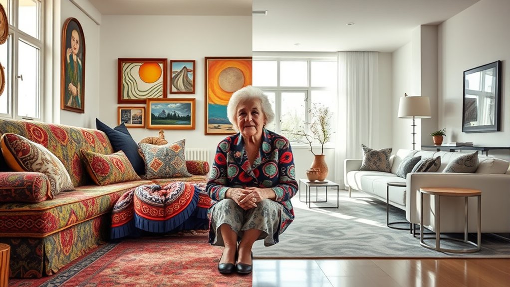 Choosing between maximalism and minimalism depends on your personality and needs as a senior. Maximalism lets you express yourself with bold colors and meaningful collectibles, but it can feel overwhelming if not organized. Minimalism offers a calm, uncluttered space that’s safer and easier to maintain. Think about what makes you comfortable and supports your lifestyle. To discover which style best suits your life and home, keep exploring more insight and tips.