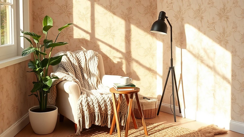 When choosing lighting options for your nook, consider how you’ll use the space. Opt for soft, warm bulb choices to create a cozy atmosphere. You might incorporate a mix of task lighting, like a reading lamp, and ambient lighting, such as string lights or a small lamp. Make sure your lighting is adjustable, so you can set the perfect mood for reading or relaxing.
