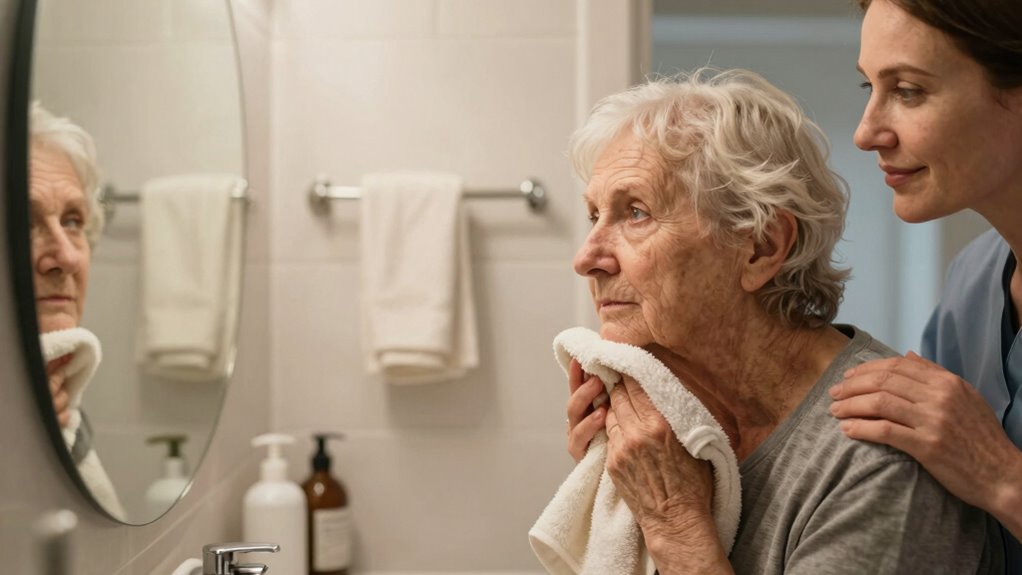 Have you noticed your loved one showing less interest in personal hygiene tasks like bathing or grooming? Reduced self-care motivation often results from cognitive decline, making it harder for them to prioritize personal hygiene. They may forget how important it is or feel overwhelmed by the task itself. To help, offer gentle reminders and create a routine that feels comfortable and manageable. Providing emotional support is essential—acknowledge their feelings and reassure them that hygiene is a way to stay healthy and comfortable. Instead of forcing hygiene routines, encourage participation in small, manageable steps. Recognizing the importance of growth mindset can help them feel more empowered to maintain their self-care. Remember, their motivation may be diminished, but your patience and understanding can make a significant difference in maintaining their dignity and well-being.