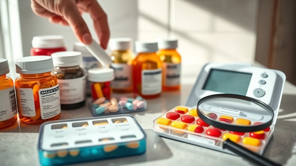 Understanding potential drug interactions is essential when managing multiple medications, as they can alter how drugs work or increase the risk of side effects. You should always monitor side effects closely and stay alert for any unusual symptoms. Recognizing allergic reactions early, such as rash, swelling, or difficulty breathing, is crucial to prevent serious complications. Before starting new medications, check for possible interactions with your current drugs by consulting your healthcare provider or pharmacist. Keep a list of all medications, including over-the-counter and supplements, and share it during appointments. Be cautious with alcohol and certain foods that may interact with your medications. Staying informed and vigilant helps minimize risks, ensuring your treatments work safely and effectively.
