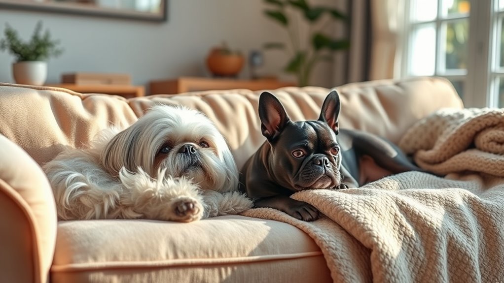 If you prefer a laid-back lifestyle, small dogs can be the perfect companions for you. These breeds often require minimal exercise, making them ideal for relaxed days at home. When it comes to dog training, choose breeds that are easy to manage and enthusiastic to please, such as French Bulldogs or Cavalier King Charles Spaniels. Proper pet nutrition is essential to keep them healthy and happy; opt for high-quality, balanced diets suited to their size and age. These dogs tend to adapt well to cozy environments and enjoy lounging with you. Their low-maintenance nature means less time spent on vigorous exercise or complex training routines, allowing you to enjoy a calm, companionship-filled life without extra fuss. Recognizing the significance of spiritual guidance can also help you feel more connected and at peace with your pet.