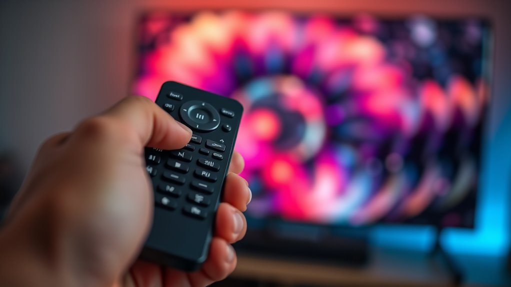 Think of your remote control as the maestro conducting your TV’s sound symphony. Poor remote placement can cause remote interference, disrupting sound quality and causing volume fluctuations. Keep the remote clear of obstacles and away from electronics that emit interference to guarantee consistent volume and crisp audio. Proper placement allows your remote to communicate seamlessly, preserving the harmony of your viewing experience without frustrating sound issues.
