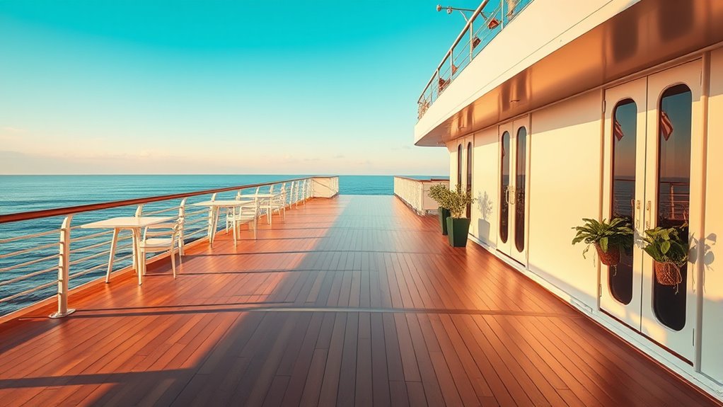 Choosing a cabin on the quiet deck can transform your cruise experience by offering a peaceful escape from busy areas and lively entertainment. These cabins are often located away from the noise of pools, theaters, and elevators, giving you a more serene environment. Booking early helps secure the best spots, and the amenities boost comfort and relaxation. If you want to discover how to find and enjoy these hidden gems, keep exploring more tips and insights.