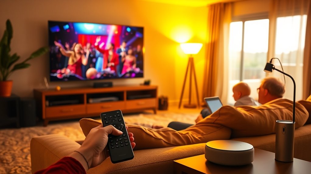 Integrating smartphone and tablet controls into your home movie setup makes it easier for everyone to enjoy movies, regardless of their mobility or dexterity. With dedicated smartphone apps, you can turn your device into a versatile remote, controlling playback, volume, and inputs effortlessly. Many streaming services and smart TVs support these apps, allowing you to bypass traditional remote limitations. Tablet remotes provide larger buttons and touchscreens that are easier to see and operate, making navigation smoother. These tools also enable quick access to subtitles, audio adjustments, and streaming options. By using familiar devices like smartphones and tablets, you create an accessible, user-friendly environment that enhances the movie-watching experience for all family members.