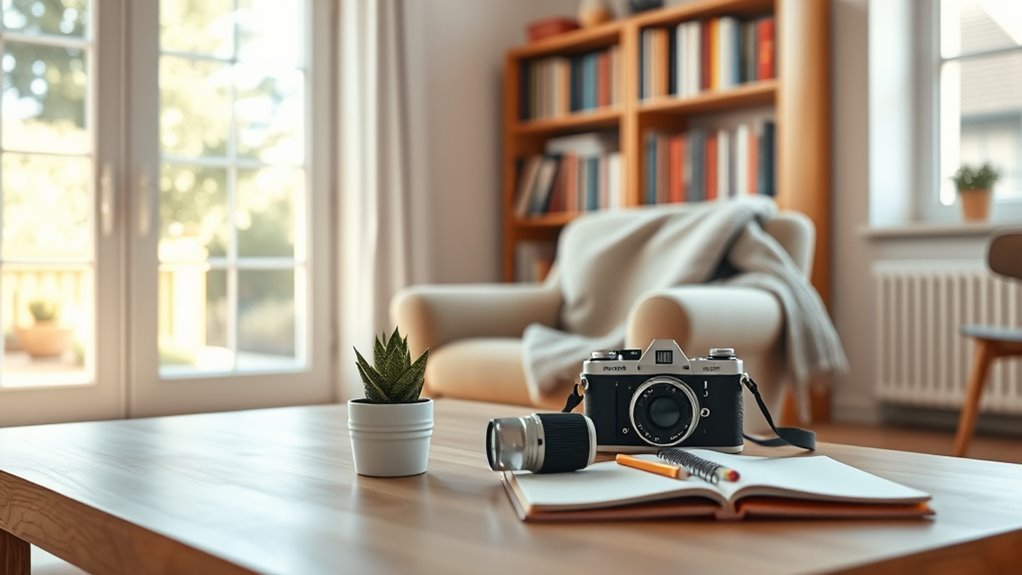 Using shadows creatively can add depth and drama to your home photography by emphasizing contrast and texture. Focus on shadow shapes to create intriguing compositions or tell stories through silhouettes. Play with light angles to cast interesting shadows on walls or surfaces, turning everyday objects into artistic elements. Experiment with silhouette storytelling by capturing figures or objects against bright backgrounds, highlighting their outlines for emotional impact. To inspire you, here’s a simple grid of ideas: