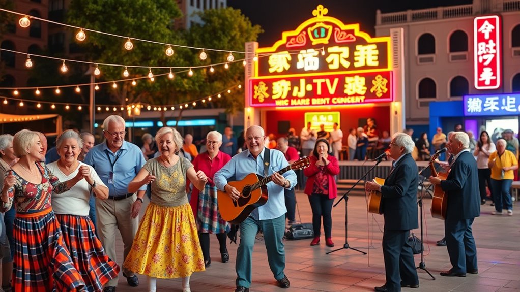 Concerts, KTV sessions, and square dancing are perfect ways to help seniors shine. These activities boost social bonds, enrich emotional well-being, and promote physical activity. You’ll see seniors sharing their talents, building friendships, and feeling connected to their community. Such lively events foster joy, purpose, and a sense of belonging. If you want to discover how these activities truly transform lives, keep exploring what makes seniors thrive in vibrant group settings.