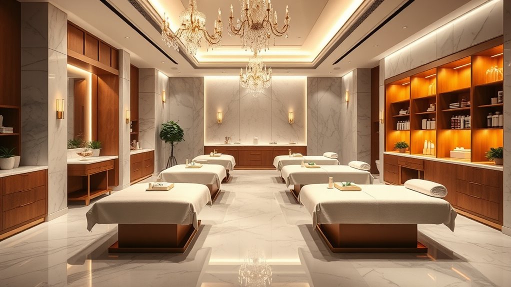 You can feel good about your visit because the spa actively minimizes its environmental footprint. They use eco-friendly products, energy-efficient lighting, and water-saving fixtures, turning sustainability into a luxurious experience. Imagine lush, organic treatments that nourish your skin and support the planet. By choosing this spa, you’re contributing to a greener future while indulging in high-end wellness, making every moment both indulgent and environmentally responsible.