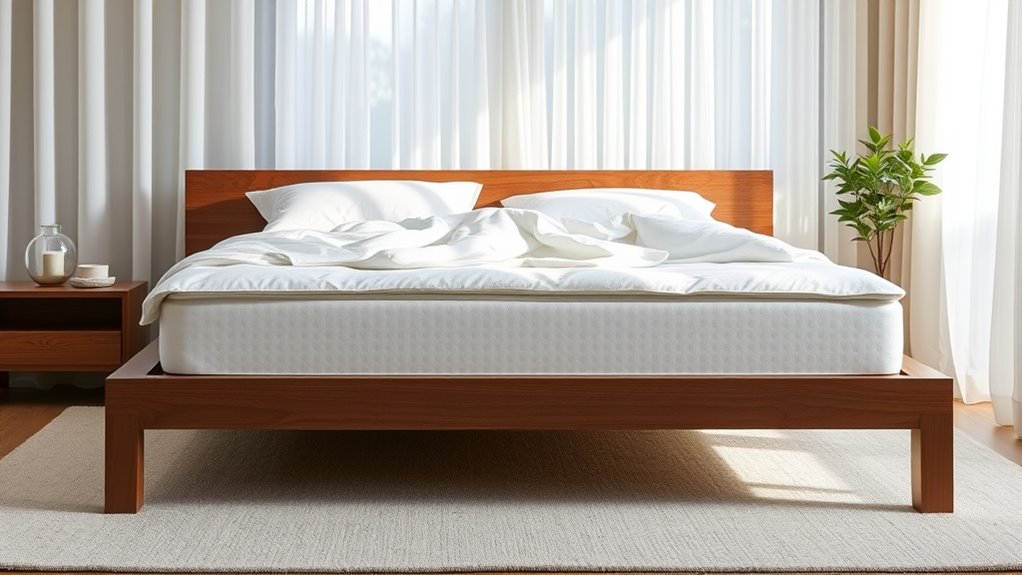 Understanding your personal comfort and sleep preferences is essential to finding the right bed and mattress setup. Your comfort depends on factors like mattress firmness, bed height, and how you like to feel when you sleep. Consider your preferred sleep hygiene habits—if you value cozy, decorative bedding, it can enhance your sleep experience, making your bed more inviting. Think about whether you prefer a softer mattress for sinking in or a firmer one for support. Your sleep position also influences comfort choices; side sleepers often favor softer surfaces, while back sleepers may prefer firmer options. Additionally, incorporating a supportive and inviting bed environment can significantly improve your overall sleep quality. By evaluating these preferences, you guarantee your bed supports restful sleep and matches your style, creating a space where you’re comfortable and relaxed every night.