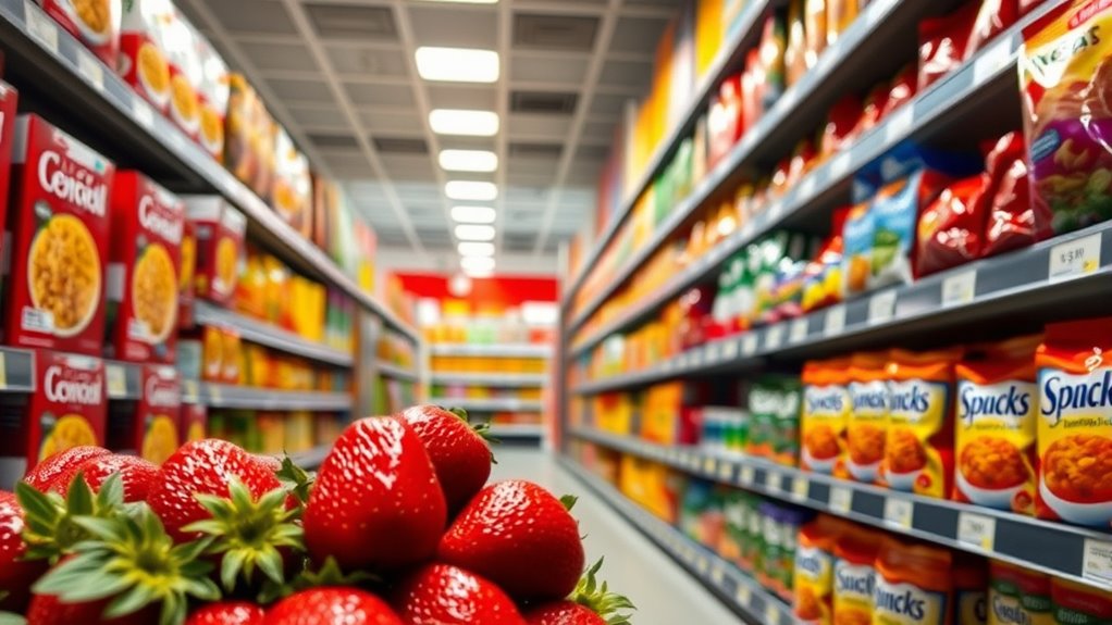 Grocery store foods that quietly spike blood sugar include packaged snacks and cereals with hidden added sugars, even those marketed as healthy. Be cautious with condiments like ketchup and barbecue sauce, which often contain high sugar levels. Flavored yogurts and dairy products can also have surprising amounts of sugar. Bread, wraps, and crackers may include hidden carbs or added sugars. Finally, fruit juices and dried fruits are concentrated sources of sugar that can cause quick spikes. Keep exploring to uncover more hidden culprits.