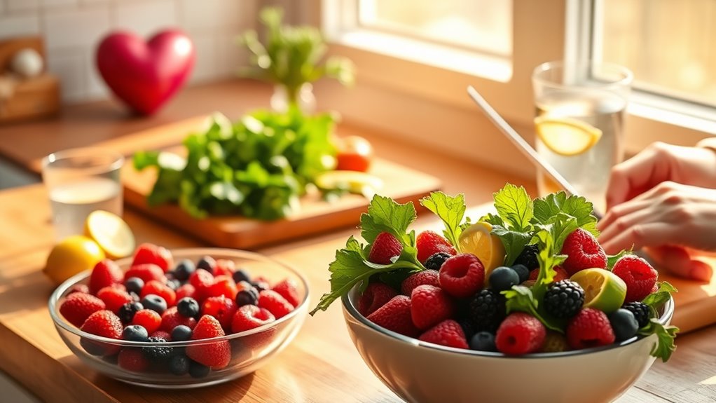 To strengthen your heart through diet, focus on incorporating more fruits, vegetables, whole grains, and lean proteins into your meals. These foods are rich in dietary fiber, which helps lower cholesterol and keeps your arteries clear. Snacking on heart healthy snacks like nuts, seeds, or fresh fruit can boost your fiber intake and prevent overeating later. Choosing whole grains over refined options adds more fiber and nutrients, supporting overall cardiovascular health. Avoid processed foods high in saturated fats and added sugars, as they can raise your risk of heart disease. Instead, prioritize natural, minimally processed foods that nourish your body and promote a healthy heart. Additionally, implementing space-saving techniques can help create a more organized and calming environment that supports your overall well-being. Small, consistent changes like these make a significant difference over time.