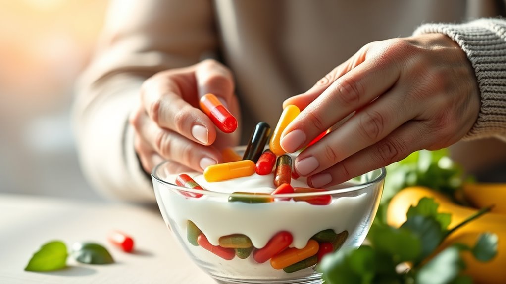 You might wonder how probiotics interact with your medications. They can potentially affect antibiotic interactions, either by competing or enhancing bacteria balance. Additionally, probiotics may influence medication absorption, helping or hindering how your body processes drugs. Always consult your healthcare provider before starting probiotics, especially if you take regular medications, to guarantee they won’t interfere with your treatment plan or cause unintended side effects.