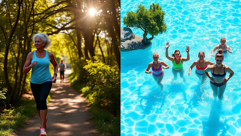 Walking and water aerobics both offer benefits for joint health, but they affect your joints differently. When you walk, your joints receive gentle stimulation that promotes joint lubrication, helping to keep your joints moving smoothly. This low-impact activity also aids in cartilage protection by encouraging healthy joint function without excessive stress. Water aerobics, on the other hand, provides resistance that strengthens muscles around your joints, offering additional support. The buoyancy reduces weight-bearing pressure, minimizing cartilage wear and tear. Both activities help maintain joint health, but water exercises are particularly gentle, making them ideal for those with existing joint issues or arthritis. Additionally, incorporating water resistance into your routine can enhance muscle strength without added strain. By choosing the right activity, you can support your joints effectively while staying active.