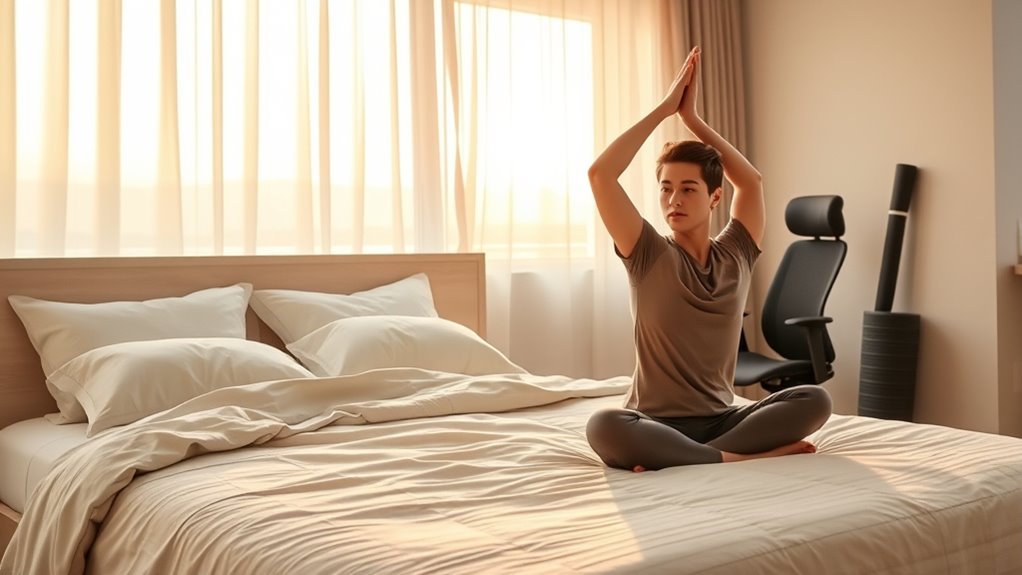 After ensuring your mattress and pillow provide proper support, incorporating gentle stretches and exercises into your morning routine can further alleviate back pain. Focus on mindful stretching, paying attention to how your body feels during each movement. Gentle exercises like cat-cow stretches, pelvic tilts, and knee-to-chest pulls help loosen tight muscles and improve flexibility. Take slow, deliberate breaths to enhance relaxation and awareness of your body. Avoid rushing through these movements; instead, maintain a gentle pace that feels comfortable. Consistent morning stretching can reduce stiffness, improve circulation, and set a positive tone for the day. Recognizing the importance of emotional support can also help you stay motivated and consistent with your routine. Over time, these mindful stretches become an effective part of your back pain prevention routine.
