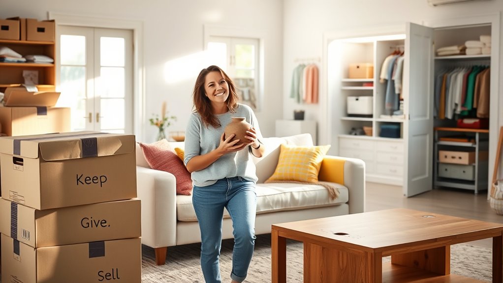 You handle sentimental items by honoring your emotional attachment while focusing on memory preservation. Take photos of items to keep the memories alive without clutter. Decide what truly matters—perhaps a few special pieces—and let go of the rest. Consider giving or donating items that no longer serve a purpose, so you maintain emotional balance without feeling overwhelmed. This way, you cherish your memories while simplifying your space.