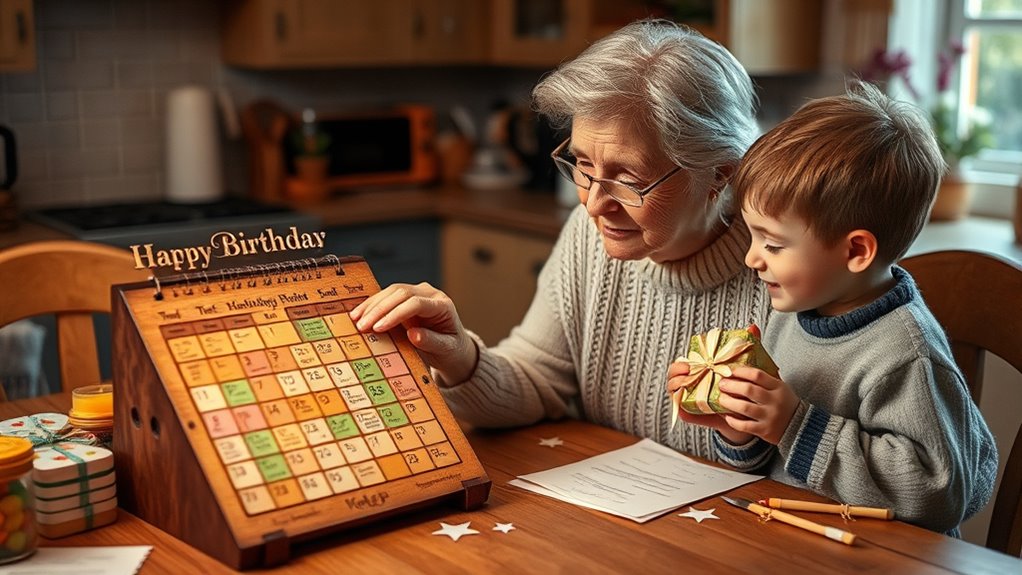 Using your smartphone to set reminders and alerts is one of the most efficient ways to guarantee grandparents never miss a birthday. This reminder technology boosts memory enhancement by providing timely prompts, reducing forgetfulness. You can schedule alerts days or hours in advance, ensuring you have plenty of time to prepare a call or gift. Many smartphones allow customization, so you can add personal notes or images to your reminders, making them more memorable. The active use of notifications reinforces your memory, creating a reliable system that supports your recall. Incorporating passive voice detection into your writing process can help eliminate unclear or weak sentence structures, making your messages clearer. With this approach, you don’t rely solely on memory; instead, you leverage technology to strengthen it. This simple yet powerful trick keeps birthdays front and center, helping you stay connected and thoughtful throughout the year.