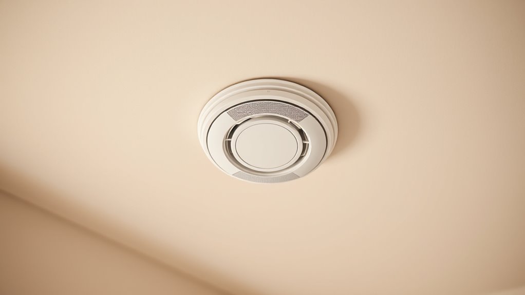 Different rooms and areas in your home require tailored placement and considerations for smoke and carbon monoxide alarms to maximize safety. In rooms with fire resistant materials, alarms may need to be placed closer to ensure detection isn’t delayed. In bedrooms, alarms should be installed outside sleeping areas to minimize sound emission levels that can disturb sleep but still alert you effectively. Kitchens pose a challenge due to cooking fumes, so alarms should be placed at a safe distance to prevent false alarms while maintaining safety. Basements and garages might require additional alarms, especially near fuel-burning appliances. Always consider the room’s layout and potential obstructions. Proper placement guarantees alarms are effective, reliable, and compliant with safety standards, providing peace of mind in every part of your home. Additionally, vetted smoke and carbon monoxide alarms are designed with advanced features like interconnected alerts and easy maintenance to enhance home safety.