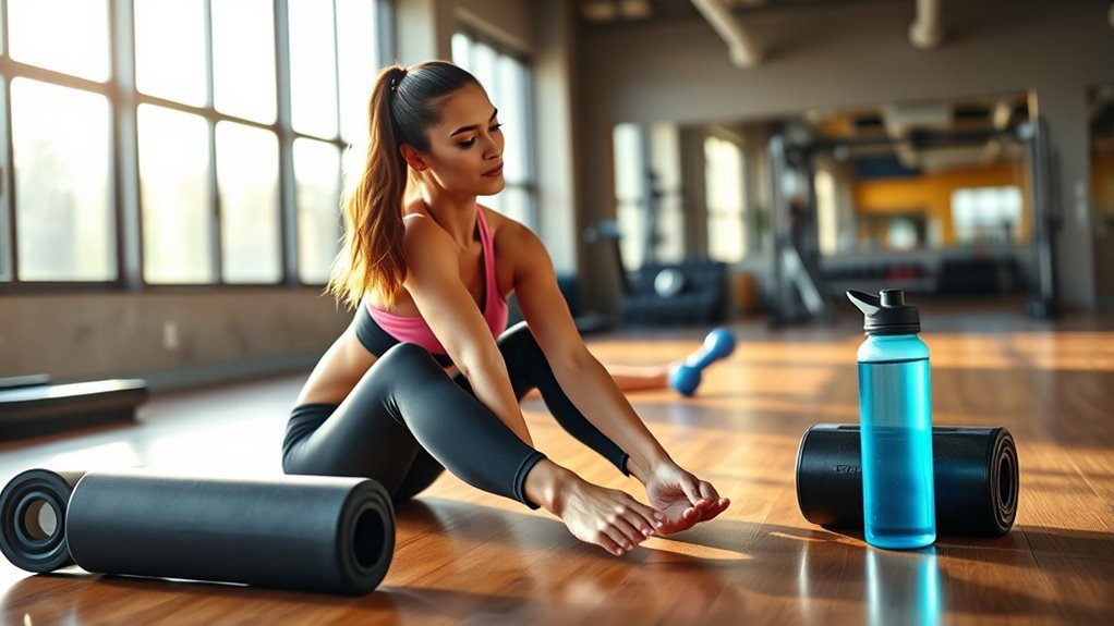 To maximize the benefits of cooling down, incorporating specific exercises can make the process more effective and enjoyable. Start with gentle post-exercise stretches targeting your major muscle groups, such as hamstrings, calves, and shoulders. Hold each stretch for about 20-30 seconds to improve flexibility and reduce muscle tension. Complement these stretches with controlled breathing exercises—inhale deeply through your nose, then exhale slowly through your mouth. This helps lower your heart rate and promotes relaxation. Focus on steady, rhythmic breaths to enhance oxygen flow and calm your nervous system. These simple cool-down exercises help your body shift smoothly from activity to rest, preventing stiffness and aiding recovery. Incorporate them into your routine consistently for ideal results. Engaging in targeted stretching can further enhance your flexibility and support a balanced, organized approach to your post-exercise routine.
