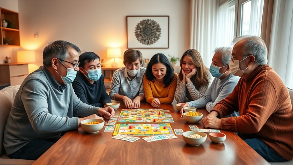To host intergenerational game nights safely, select inclusive, age-appropriate games and prepare a clutter-free, well-lit environment with comfortable seating. Guarantee all participants follow hygiene practices like hand sanitizing and disinfecting game pieces regularly. Communicate clearly and respect everyone’s comfort levels, adapting rules as needed to foster inclusivity. Consider accessibility and sensory needs to create a welcoming space. Keep exploring these strategies to make your event both safe and enjoyable for all involved.