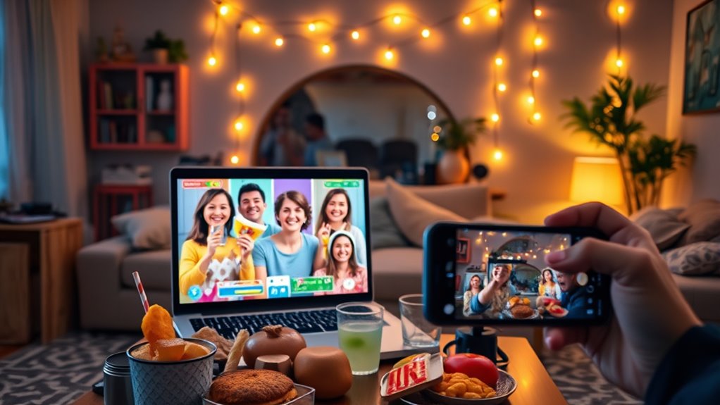 You can spice up your virtual game nights by choosing creative themes like costume parties with themed dress codes that inspire everyone to dress up. Incorporate customized game challenges tailored to the theme, making the experience more engaging. Think of a ’80s night or movie character challenge, encouraging players to get creative and have fun. These ideas keep the energy high and guarantee everyone stays excited, no matter where they are.