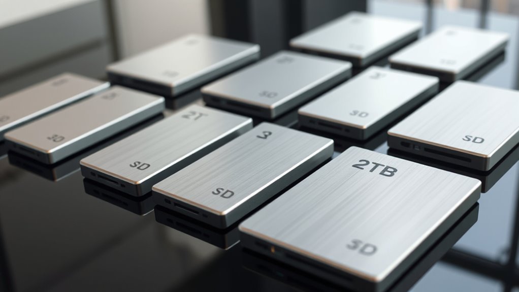 When selecting a 2TB portable SSD with hardware encryption, I focus on encryption standards, device compatibility, durability, transfer speeds, and design. These factors guarantee the drive meets my security needs and fits into my workflow seamlessly. Considering each aspect helps me choose a reliable, efficient, and portable storage solution.