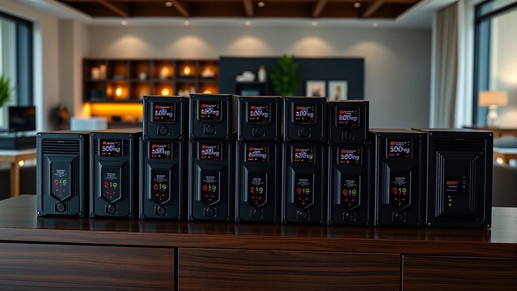 Think of these inverters like a trusted guardian—absolutely reliable. Yes, they come with safety features like overload protection, short-circuit prevention, and thermal cut-off to keep your devices safe. They also often include low-voltage alerts and fuse protection, acting like a shield during power fluctuations. I’ve found that these features give me peace of mind, knowing my home and electronics are protected during every backup.