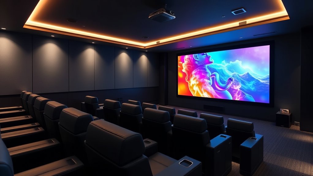 Ever wondered how brightness impacts your home theater experience? Brightness, measured in lumens, determines how vivid and clear your images appear. More lumens mean a brighter picture, which is essential if your room has lots of windows or ambient light. For typical home theaters with controlled lighting, 1500 to 3000 lumens usually do the trick. If your space is larger or brighter, you’ll want a projector with over 3000 lumens to maintain image quality. Lumens measure the projector’s overall brightness output, but it’s important to balance this with contrast ratio and resolution for the best picture. Too much brightness can wash out details, so finding the right level for your environment guarantees sharp, vibrant visuals without sacrificing clarity.