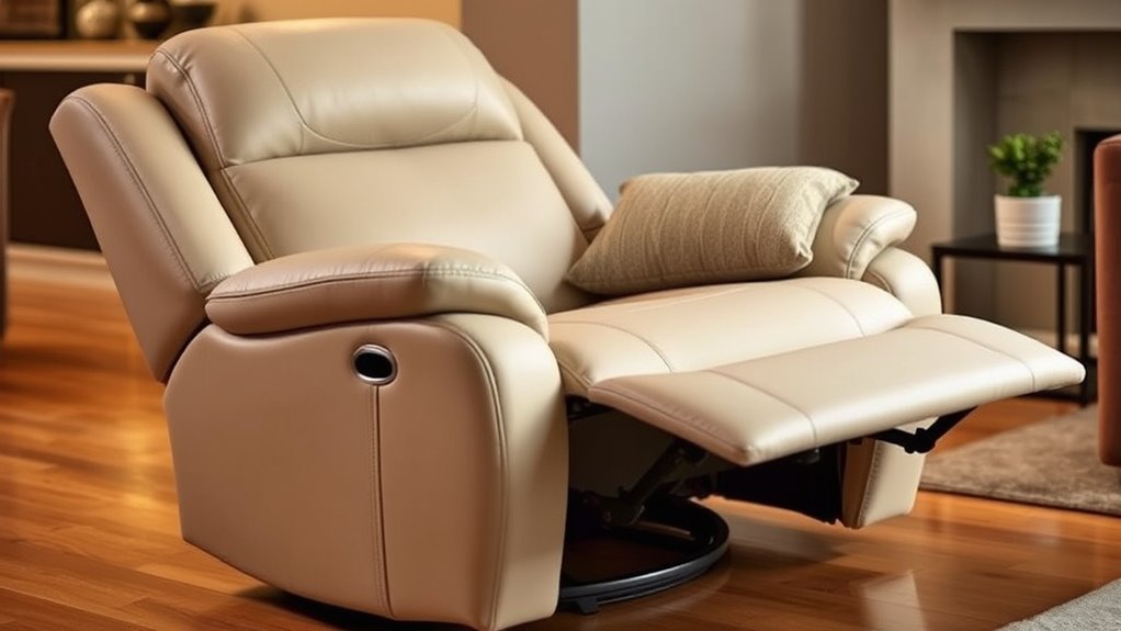Recline adjustment features play a crucial role in guaranteeing your comfort and convenience when selecting an 8-reclining lift chair. I look for chairs with infinite or multiple preset recline angles—up to 135°, 140°, or even 180°—so I can customize my position easily. Dual motor systems are a big plus because they allow independent control of the backrest and footrest, giving me seamless, personalized comfort. I also prioritize smooth, quiet recline mechanisms to avoid disruptions. An intuitive remote or control panel is essential for quick adjustments, making it simple to find the perfect angle. Finally, I check for zero-gravity or full recline functions, which help reduce pressure and offer complete relaxation. These features guarantee the chair adapts to my needs for maximum comfort.