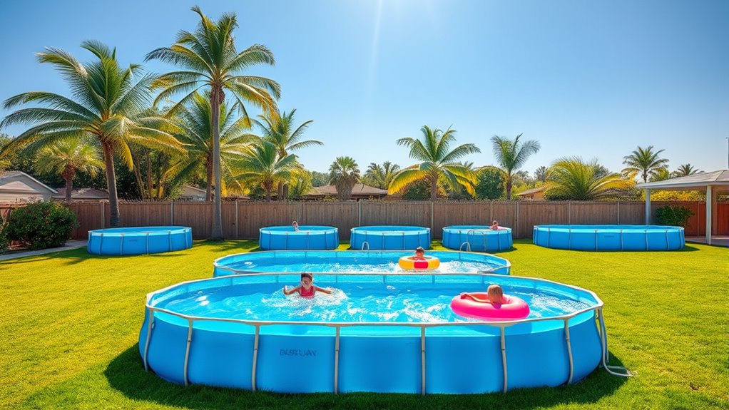 Are you clear on how much you’re willing to spend on your above ground pool? Setting a budget is essential before shopping. Think about the total cost, including accessories, installation, and ongoing maintenance like filters and chemicals. Comparing prices across brands and models helps you find options that fit your financial limits. Remember, larger pools with extra features usually cost more, so choose a size and style that matches your budget. Keep an eye out for sales, discounts, or bundle deals to maximize your value. Planning ahead guarantees you don’t overspend and helps you select a pool that meets your needs without breaking the bank. Staying within your price range makes the entire process more enjoyable and stress-free.