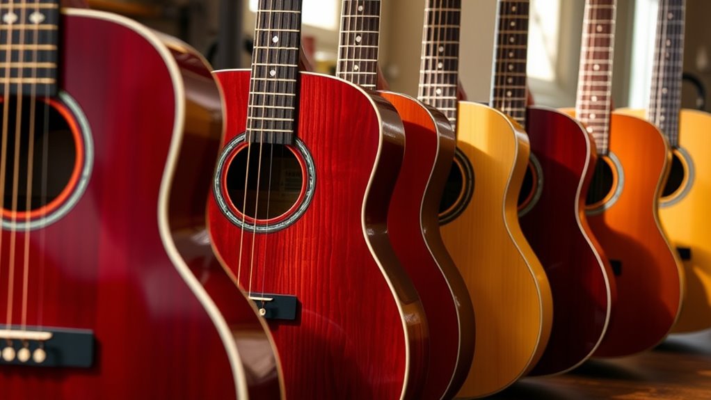 When selecting an acoustic guitar, considering the accessories included can make a big difference in your playing experience. Essential items like gig bags, tuners, straps, picks, and extra strings provide convenience and allow you to start playing right away. Opting for complete starter kits that include learning aids such as instructional DVDs, chord posters, or online lessons can accelerate your progress, especially for beginners. Protective accessories like padded gig bags or cases are vital for safe transportation and storage. It’s also important to evaluate the quality and compatibility of included accessories, ensuring they’re durable and functional. Bundled accessories not only add value but also make learning easier, helping you get the most out of your new guitar from day one.