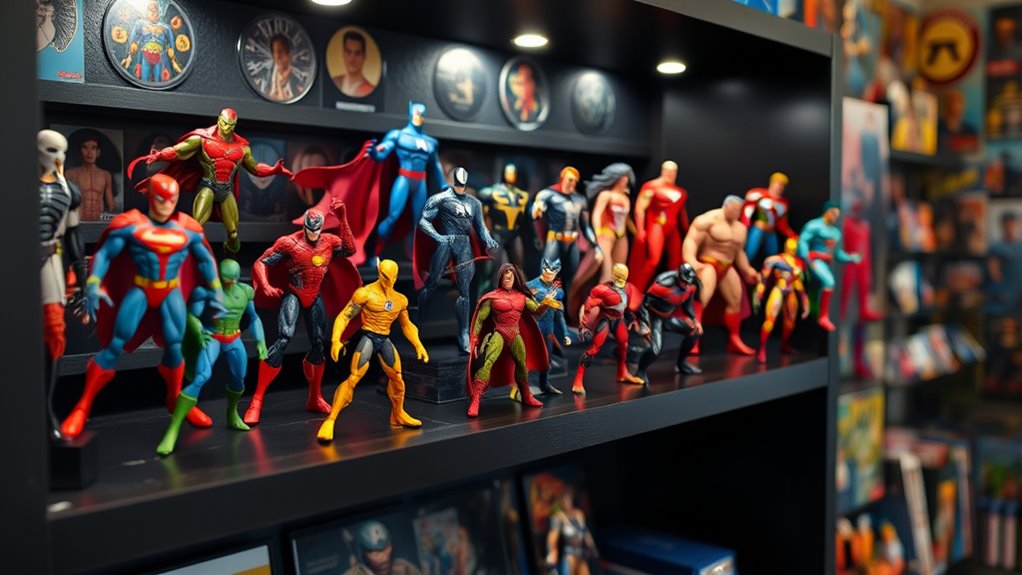Choosing action figures collectibles isn’t just about aesthetics; it involves considering brand reputation and licensing. Recognized brands and licensed characters usually guarantee higher quality and authenticity, which is vital for any serious collector. Licensing agreements ensure that figures align with official design standards, reflecting the character’s true look. I’ve found that established brands with solid reputations offer more durable, well-articulated, and detailed collectibles that stand the test of time. Plus, licensed action figures often come in official packaging with accessories, enhancing their overall appeal. This not only boosts their visual impact but also improves resale potential. Trusting a brand’s reputation is essential, as it directly influences the perceived value of your collection.