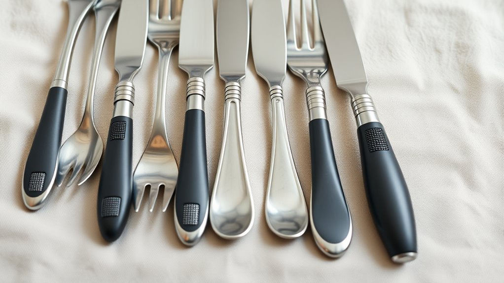 Choosing the right adaptive utensils starts with considering grip comfort and size, as these factors directly impact ease of use and fatigue. Ergonomic handles with enlarged or built-up designs make gripping easier for those with limited hand strength. Soft, non-slip materials like silicone or rubber increase friction, reducing the effort needed to hold utensils securely. Handle size should match the user’s hand, providing enough surface area for a comfortable grip without causing strain. Adjustable or flexible handles are helpful for varying hand sizes or deformities, offering better control and stability. Proper handle design also minimizes wrist and finger strain, promoting a natural hand position. Prioritizing these aspects guarantees a more comfortable dining experience and reduces fatigue during mealtimes.
