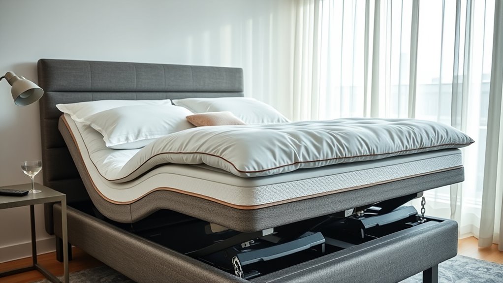 Adjustable bed positions can dramatically improve spinal alignment and reduce muscle tension, offering relief from back pain. When I elevate the head or legs, I notice less strain on my lower back and neck, unlike lying flat which sometimes worsens discomfort. These positions help distribute weight evenly and support natural curves, easing muscle tension. It’s like giving your spine a gentle reset, making restful sleep more achievable.