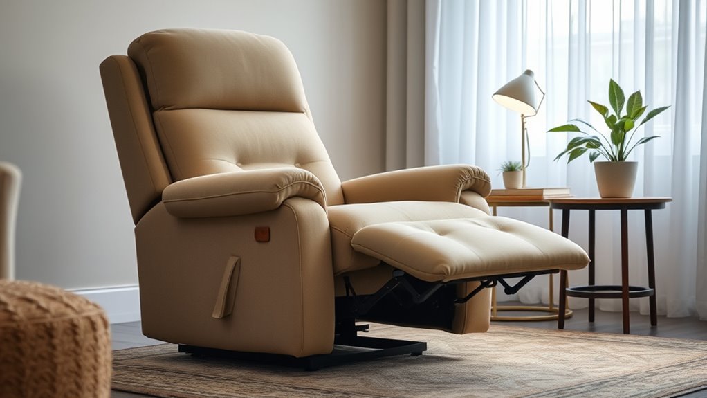 Affordable lift chairs for seniors include essential safety features like sturdy locking mechanisms to prevent accidental recline, secure footrests that stay in place, and reliable emergency release systems. I look for chairs with smooth, controlled movement to avoid sudden jerks, ensuring safety during operation. Many also have weight capacity limits clearly marked, non-slip bases, and plush padding to prevent falls or discomfort, giving me peace of mind when using or assisting others.