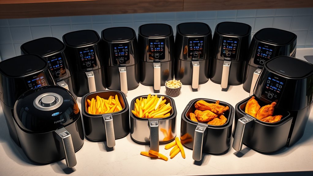 As I browsed these budget-friendly air fryers, it struck me how each one offers crispy perfection without breaking the bank—like finding a hidden gem in a busy market. Whether it’s a sleek touchscreen or versatile presets, these options fit perfectly into any kitchen. Just like stumbling upon that perfect spice at the back of a shelf, these affordable fryers prove you don’t need to spend a fortune to enjoy delicious, crispy meals every day.
