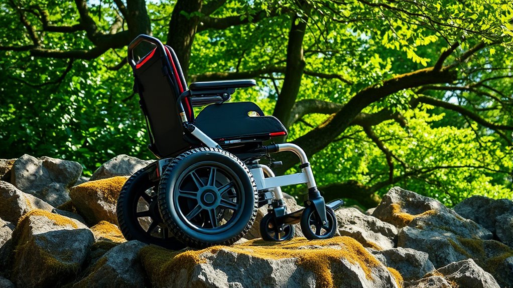 Safety mechanisms are essential in all-terrain electric wheelchairs because they directly impact user security on unpredictable surfaces. I look for models with electromagnetic brakes, which provide reliable stopping power on slopes and uneven terrain. Anti-tip wheels are crucial, especially during sharp turns or steep inclines, to prevent tipping. Safety belts are a must to secure the user and reduce injury risk during movement. I also check for automatic or manual safety features like emergency stop buttons or automatic braking systems, which add an extra layer of security. A sturdy frame combined with shock absorption systems helps maintain stability across rough terrain. These features collectively guarantee safety without compromising mobility, giving me peace of mind when traversing challenging environments.