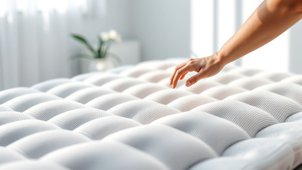 A quiet mattress pump is crucial for ensuring restful sleep and effective healing, especially for those sensitive to noise. When selecting an alternating pressure mattress, look for models with noise levels below 28 dBA, which mimic soft background sounds. Whisper-quiet pumps operate at these low levels, providing a peaceful environment that minimizes sleep disruptions. Higher noise levels can disturb rest, increase stress, and reduce the therapy’s effectiveness. For patients with sensitive sleep patterns or those needing uninterrupted rest, quiet operation becomes even more critical. Always verify the noise level specifications before purchasing, ensuring the mattress maintains a calming atmosphere conducive to healing. A quiet pump helps maximize comfort and recovery, making it a indispensable factor in your choice.