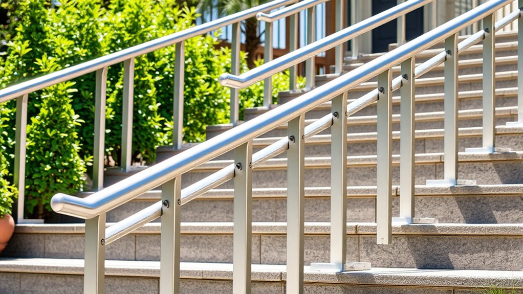 Back in the day, aluminum was the go-to for many outdoor projects, and it still holds up today. Aluminum handrails are generally suitable for most outdoor climates because they’re resistant to rust and corrosion. However, in harsh environments like coastal areas with salty air, I recommend choosing a high-quality, coated aluminum to guarantee longevity. Overall, aluminum’s durability makes it a reliable choice for various outdoor settings.