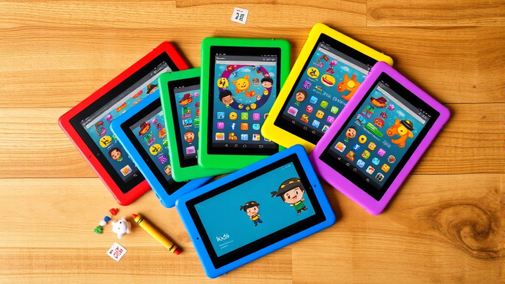 I’ve explored the top Amazon Fire tablets designed for kids, focusing on safety, durability, and fun features. From the Fire HD 10 Kids Pro to the compact Fire 7 models, these tablets come with sturdy cases, vibrant screens, long battery life, and parental controls that make them both safe and engaging. Whether you need a budget-friendly option or a more advanced device, I’ll help you discover the best choices. Keep going to find out more details.