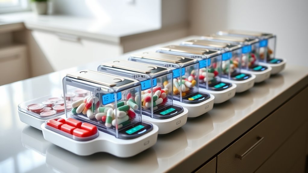 Choosing the right automatic pill organizer can feel overwhelming, but remember, it’s about balancing simplicity with smart features. While some models offer sleek designs, others focus on advanced alarms and large compartments. It’s like choosing between a minimalist tool and a high-tech gadget—you need what fits your lifestyle. Whichever you pick, making medication management easier shouldn’t be complicated. After all, it’s about peace of mind, not just pills—giving you control and confidence every day.