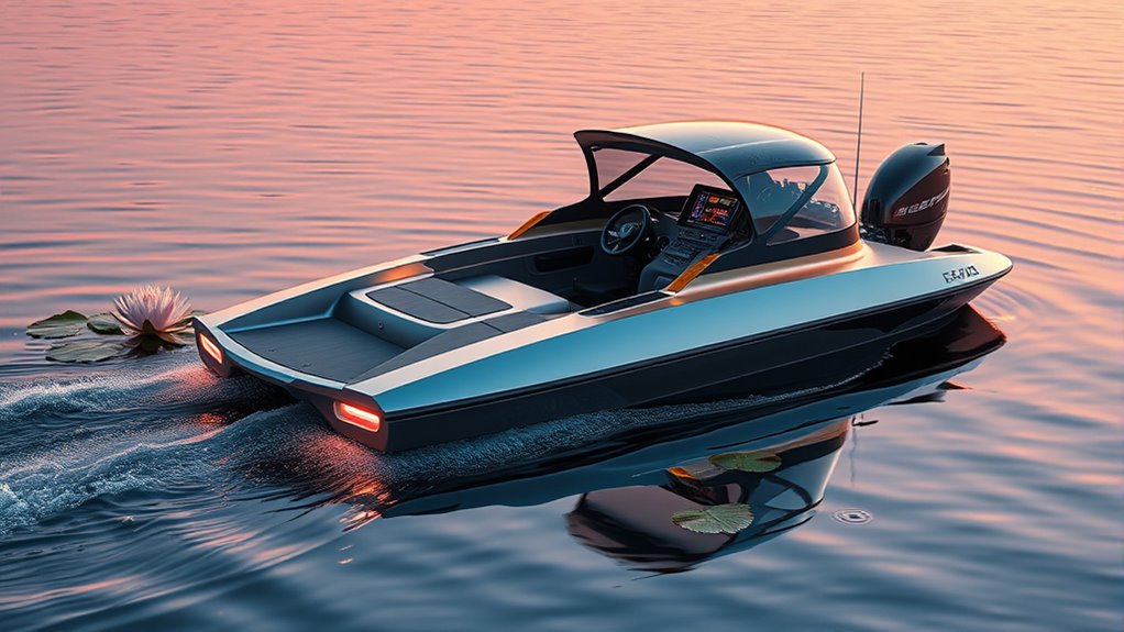 To maximize your chances of a successful carp catch, selecting a bait boat with low noise and stealth features is essential. Low noise operation, like silent brushless motors, prevents scaring fish away. Stealth elements such as tangle-proof propellers and streamlined hulls minimize water disturbance and visibility, keeping your presence discreet. Reducing vibrations and noise from components helps maintain a natural environment, increasing baiting success. Automatic yaw correction and steady navigation prevent sudden movements that could alert fish. For night fishing, quiet LED lights allow discreet operation without disruptive flashes or sounds. Overall, a bait boat designed with stealth and noise reduction in mind ensures you can approach feeding carp silently, boosting your chances of a successful session.