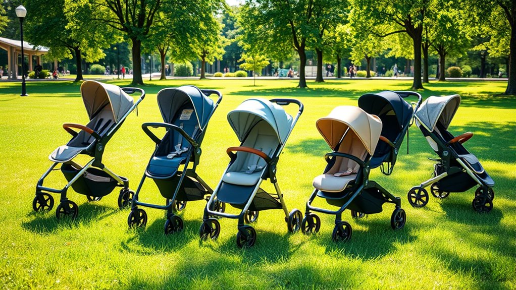 When I consider a stroller, maneuverability is often at the top of my list, since it directly affects how easily I can navigate different environments. The type of wheels plays a vital role; air-filled wheels glide smoothly over rough terrain, while foam wheels are lighter and puncture-proof. I find that swivel front wheels make it easy to turn in tight spaces, but locking them provides stability on uneven ground. Larger rear wheels enhance steering on grassy areas, which I appreciate during park outings. Additionally, all-wheel suspension systems help absorb shocks, improving comfort for my little one. Ultimately, whether I choose a three-wheel or four-wheel setup impacts both turning ease and overall handling, making it an essential consideration.