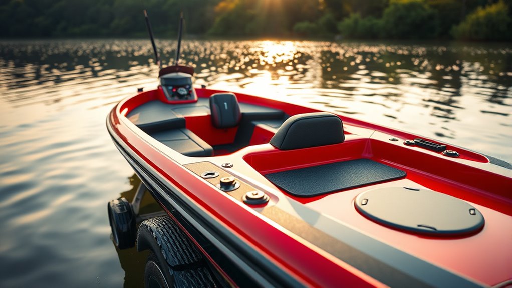 When choosing a beginner bait boat, I look for safety features like a sturdy, waterproof design to prevent damage and water ingress. I also prioritize a reliable remote control with a secure signal range, avoiding interference. An emergency stop button is a must, along with low battery alerts to prevent unexpected shutoffs. These features guarantee my fishing trips are safe, enjoyable, and stress-free, giving me peace of mind on the water.