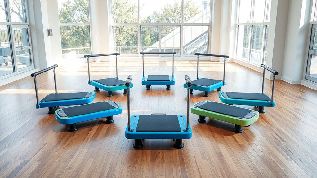 Safety rails are typically made from sturdy materials like heavy-duty steel or reinforced aluminum, which provide durability and strength. Some models also incorporate high-impact plastics or rubber coatings to enhance safety and grip. I recommend choosing rails with a non-slip coating to prevent slips and guarantee stability during workouts. These materials are designed to withstand repeated use, offering long-lasting security for your balance training sessions.