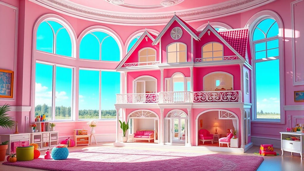 Choosing the right Barbie Dreamhouse depends heavily on the available space in your home. I recommend measuring the area where you plan to place the dollhouse to guarantee it fits comfortably without overcrowding. Pay attention to the dimensions—height, width, and depth—to match your space needs. Consider if the set can be easily moved or stored when not in use; larger dollhouses might require extra storage solutions. Also, think about how the size complements other toys or furniture in the play area to avoid clutter. Remember, bigger sets can be impressive but may demand more space and effort to keep organized. Making sure the size aligns with your available space will help you choose a Dreamhouse that’s fun without becoming overwhelming.