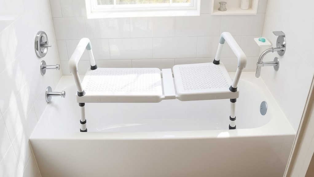Safety features are crucial to guarantee seniors can use bathtub transfer benches confidently and securely. I look for benches with non-slip suction cups or rubber feet to prevent shifting on wet surfaces, ensuring stability during transfers. Built-in safety belts or armrests add extra support and security, giving both the user and caregiver peace of mind. Slip-resistant surfaces on the seat and edges help reduce the risk of falls, especially when the surface is wet. Adjustable height settings with secure locking mechanisms are essential to match different tub and user heights, maintaining stability throughout use. Additionally, anti-slip grips or textured surfaces improve footing, giving users better control and confidence. These safety features collectively create a safer, more reliable environment for seniors during bath transfers.